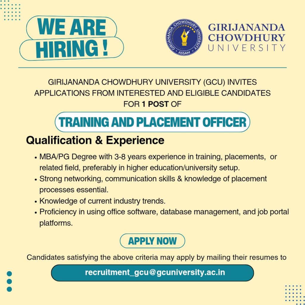 Girijananda Chowdhury University (GCU) is looking for a passionate Training & Placement Officer to join the team and shape future careers.