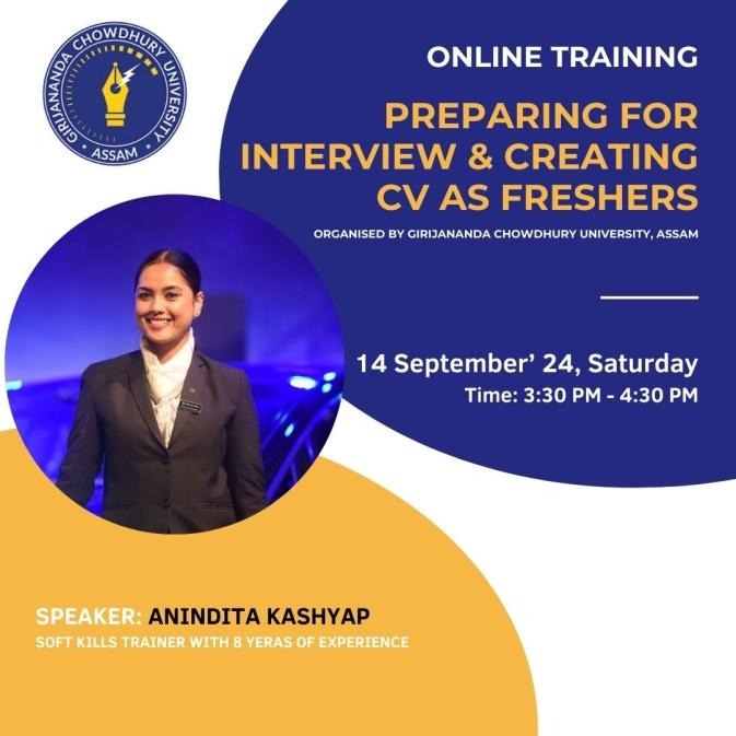 On September 14, 2024, the Training and Placement Cell of Girijananda Chowdhury University organized an online training session on “Preparation for Interviews & Creating CVs as Freshers” for the students of the School of Engineering & Technology.