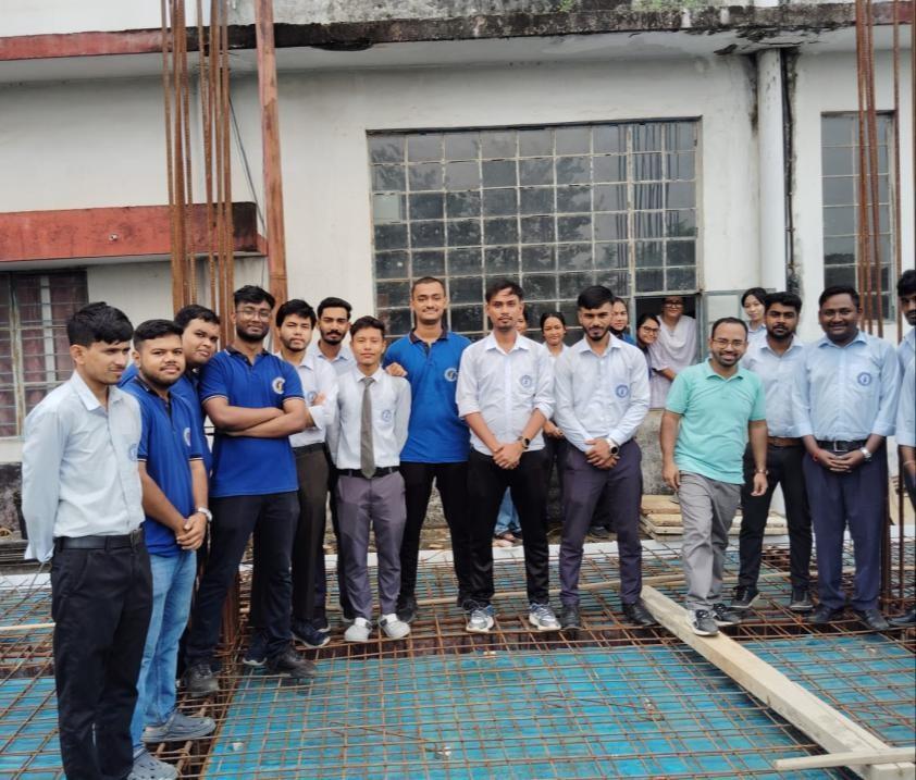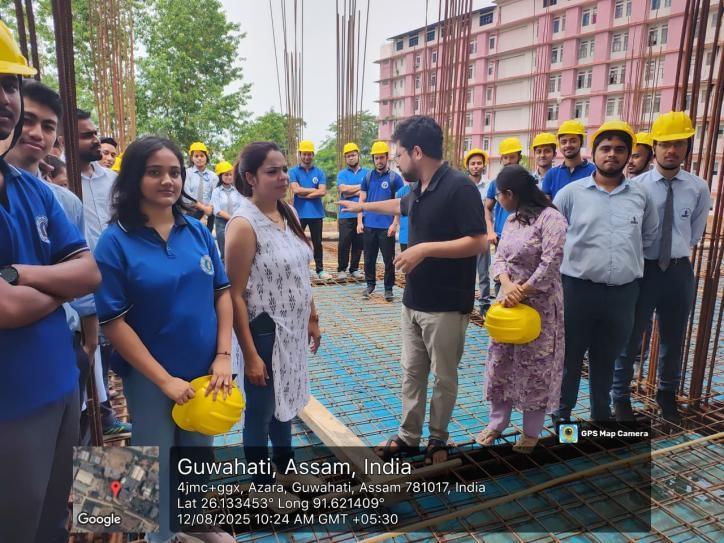 The B.Tech 5th and 7th semester students from the Department of Civil Engineering, GCU were exposed to various aspects of construction work through a site visit within the campus on 12th August 2025. Before the visit, they were introduced to different safety measures and instructed to wear the necessary safety gear, including helmets, to protect themselves from potential hazards.