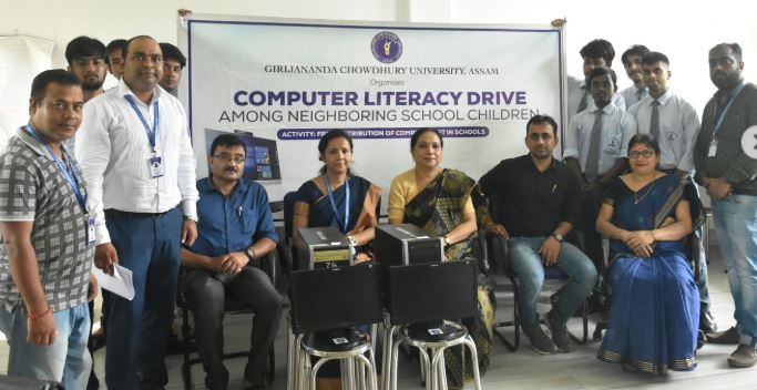 Girijananda Chowdhury University (GCU) organizes a Computer Literacy Drive in neighbouring school children. The 1st phase of the drive is successfully accomplished on 26.08.23. The University donated a total of four sets of desktop computers to Jalukbari Higher Secondary School and Jalukbari Girls’ High School respectively. In the event, Dr. Dipankar Saha, Registrar, GCU handed over the items to Mrs Sarifa Ara Ahmed, Principal, Jalukbari Higher Secondary School and Syed Mazid Ali, Head Master, Jalukbari Girls’ High School. The event was coordinated by the faculties and students of the department of ECE.