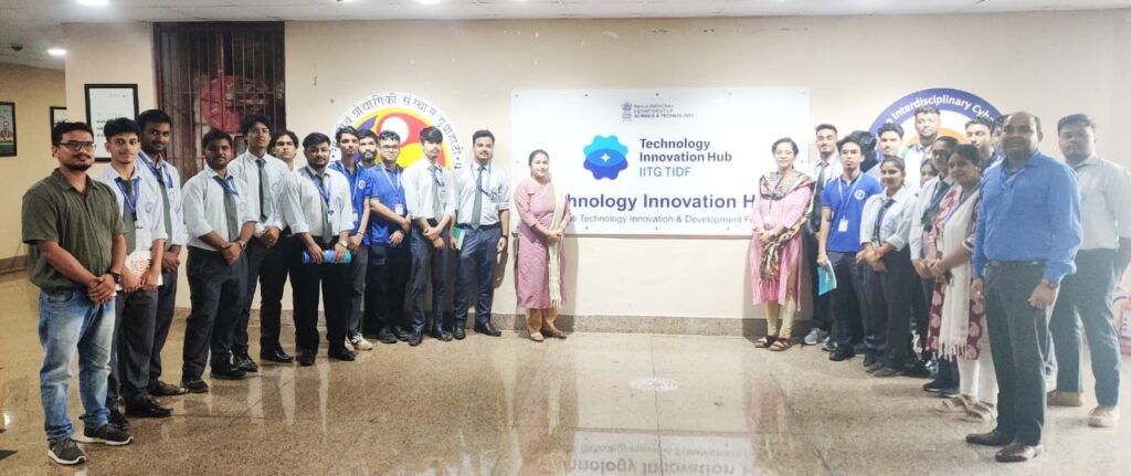 The Department of Electronics and Communication Engineering, Girijananda Chowdhury University, Assam, organised an industrial visit to the Technology Innovation Hub (TIH) at IIT Guwahati on 11th November 2025, with 22 students (from the 2024-28 and 2025-29 batches) and 3 faculty members. The visit aimed to provide students with practical exposure to ongoing technological research and innovation in electronics and related areas. During the visit, students were briefed about the objectives and activities of the TIH under the National Mission on Interdisciplinary Cyber-Physical Systems (NM-ICPS) by Dr. Pratiksha Sarma.