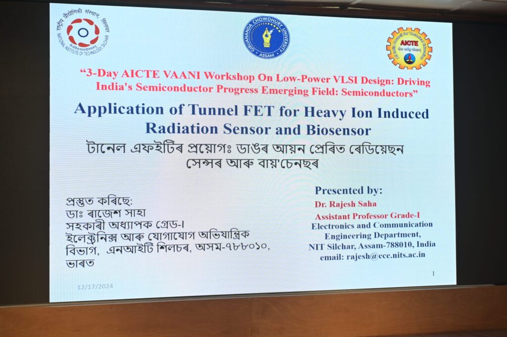 Dr. Rajesh Saha, Assistant Professor in the Department of ECE, NIT Silchar, delivered a session on the Application of Tunnel FET for Heavy Ion Induced Radiation Sensors and Biosensors. His presentation focused on the innovative use of Tunnel Field-Effect Transistors (Tunnel FETs) in radiation sensing and biosensing applications. It is noteworthy that Dr. Saha has been recognized in the 2023-2024 World Ranking of the Top 2% Scientists in the field of Nanoscience & Nanotechnology by Stanford University and Elsevier, marking a significant achievement in his academic career.