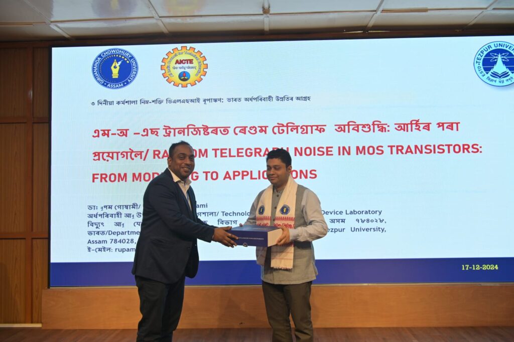 Dr. Rupam Goswami, Assistant Professor at Tezpur University, presented on Random Telegraph Noise in MOS Transistor: From Modelling to Simulation, where he discussed the challenges and advancements in understanding random noise phenomena in MOS transistors. His talk provided crucial insights into how random telegraph noise affects the reliability of VLSI circuits, an important area for the development of high-performance semiconductor devices. Dr. Goswami has 1 patent and 2 designs in his credit. He is an IEEE senior member and recipient of Young Scientist Award by Government of Assam.