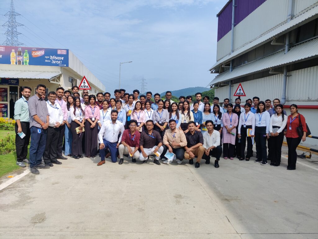 On 11th October 2025, the Department of Business Administration organized an industrial visit for the MBA 1st semester students to Jericho Food & Beverages LLP (Campa), located in Changsari. A total of 56 students participated in the one-day educational trip, accompanied by three faculty members – Dr. Abhinav Sarma, Mr. Faruk Ahmed and Mr. Sasanka Bujarbaruah, all Assistant Professors in the department. The primary objective of the visit was to provide students with practical exposure to the operations of a beverage manufacturing plant and to bridge the gap between academic learning and industrial practices.