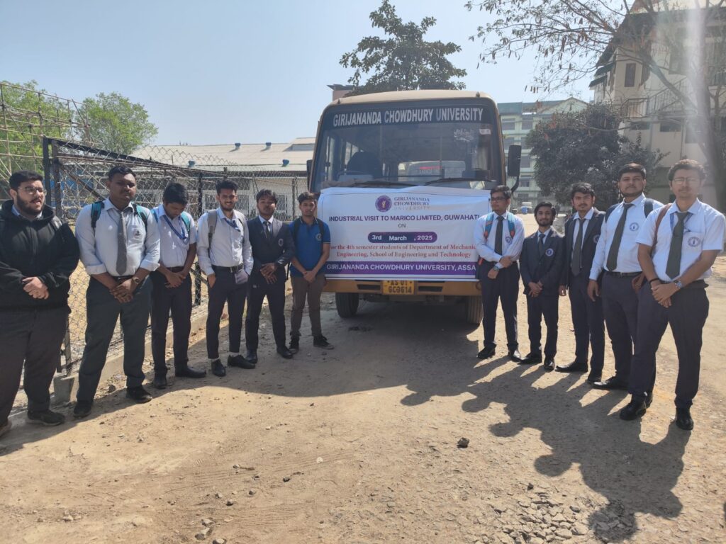 On 3rd March, 2025, the B.Tech 4th semester students of Department of Mechanical Engineering, Girijananda Chowdhury University, Guwahati along with Mr. Swapnaneel Sarma, (Assistant Professor, Mechanical Engineering Department) and Mr. Nilam Bharadwaj (Laboratory Instructor, Mechanical Engineering Department) visited Marico Limited production facility in Brahmaputra Industrial Park, North Guwahati, Assam.