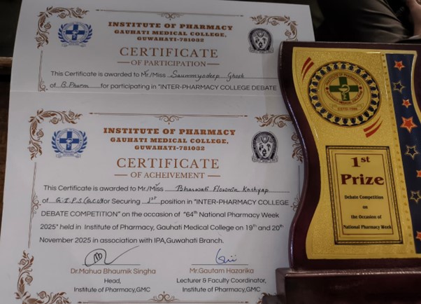 Girijananda Chowdhury University (GCU), Guwahati appreciates the achievement of Mr. Soumyadeep Ghosh and Ms. Bhaswati Flowrina Kashyap, students of B. Pharm 5th sem for securing first position at the Inter-Pharmacy College Debate Competition organized by the Institute of Pharmacy, Gauhati Medical College, as part of the 64th National Pharmacy Week celebrations held on 19th and 20th November 2025.