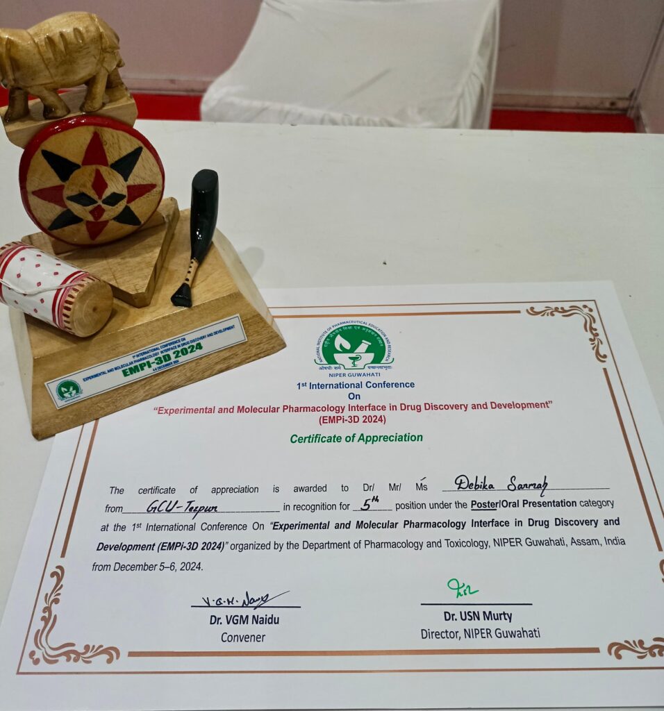We are proud to announce that Ms. Debika Sarmah, Assistant Professor at the School of Pharmaceutical Sciences, Girijananda Chowdhury University, Tezpur Campus, has been awarded the Fifth Best Poster Presentation Award at the 1st International Conference on Experimental and Molecular Pharmacology Interface in Drug Discovery and Development (EMPi-3D) 2024.