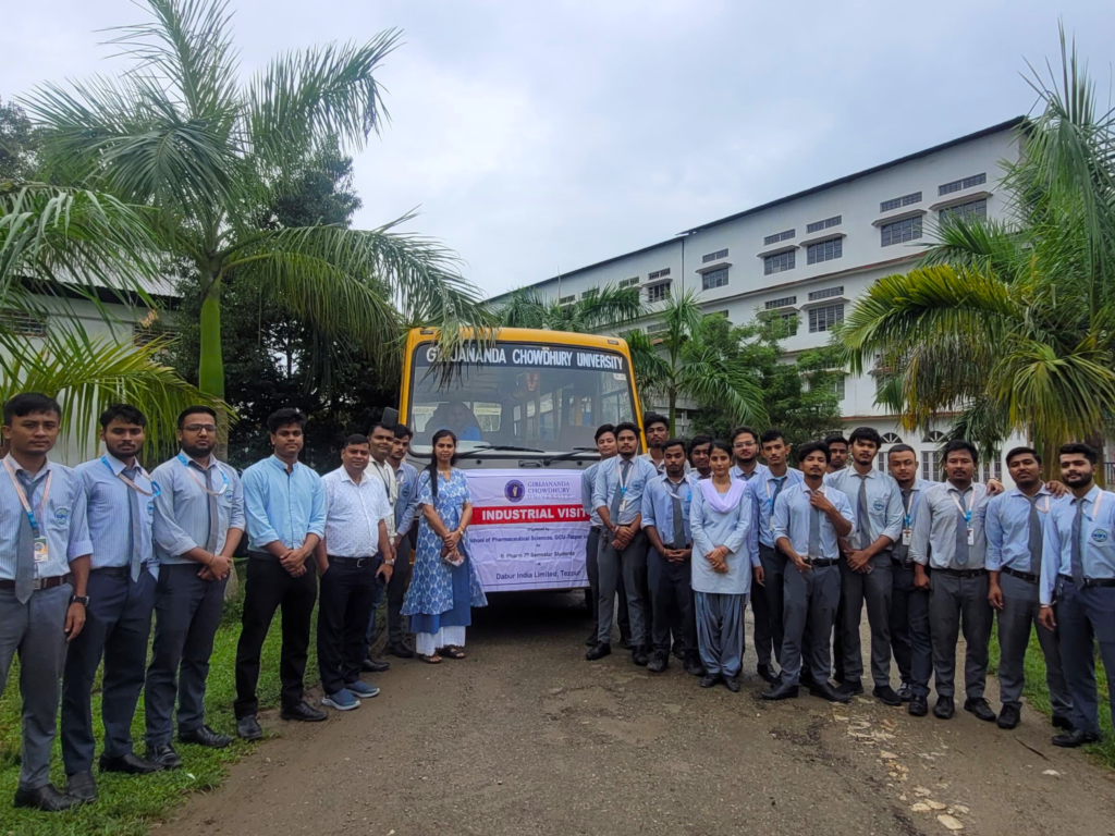 The B. Pharm 7th semester students of the School of Pharmaceutical Sciences at GCU Tezpur recently participated in an industrial visit to Dabur India Limited, organized by the Training and Career Guidance Cell. A total of 61 students, divided into two batches, accompanied by four faculty members, explored the facilities of Dabur on two separate days.