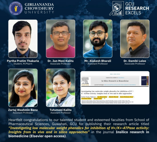 Heartfelt congratulations to our talented student and esteemed faculties from School of Pharmaceutical Sciences, Guwahati, GCU for publishing their research article titled “Investigating low molecular weight phenolics for inhibition of H+/K+-ATPase activity: Insights from in vivo and in silico approaches” in the journal Insilico research in biomedicine (Elsevier open access). The entire investigation was carried out under the supervision of Prof. Damiki Laloo.