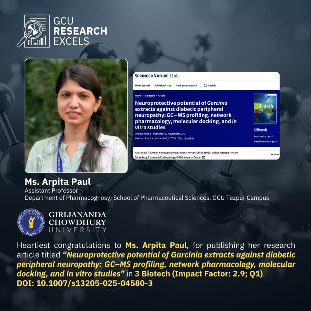 We are pleased to congratulate Ms. Arpita Paul, Assistant Professor, Department of Pharmacognosy, on the publication of her research article titled “Neuroprotective potential of Garcinia extracts against diabetic peripheral neuropathy: GC–MS profiling, network pharmacology, molecular docking, and in vitro studies” in 3 Biotech (Impact Factor: 2.9; Q1).