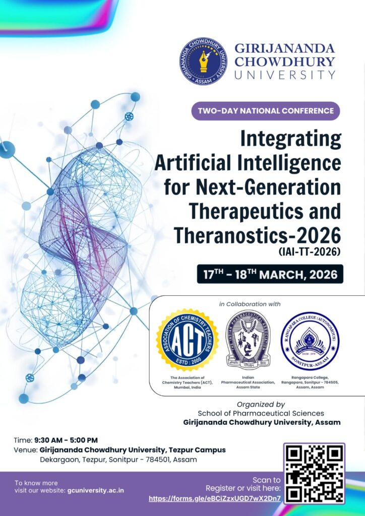 The School of Pharmaceutical Sciences of Girijananda Chowdhury University, Tezpur Campus is going to organized a Two-Day National Conference “Integrating Artificial Intelligence for Next-Generation Therapeutics and Theranostics-2026 (IAI-TT-2026)”