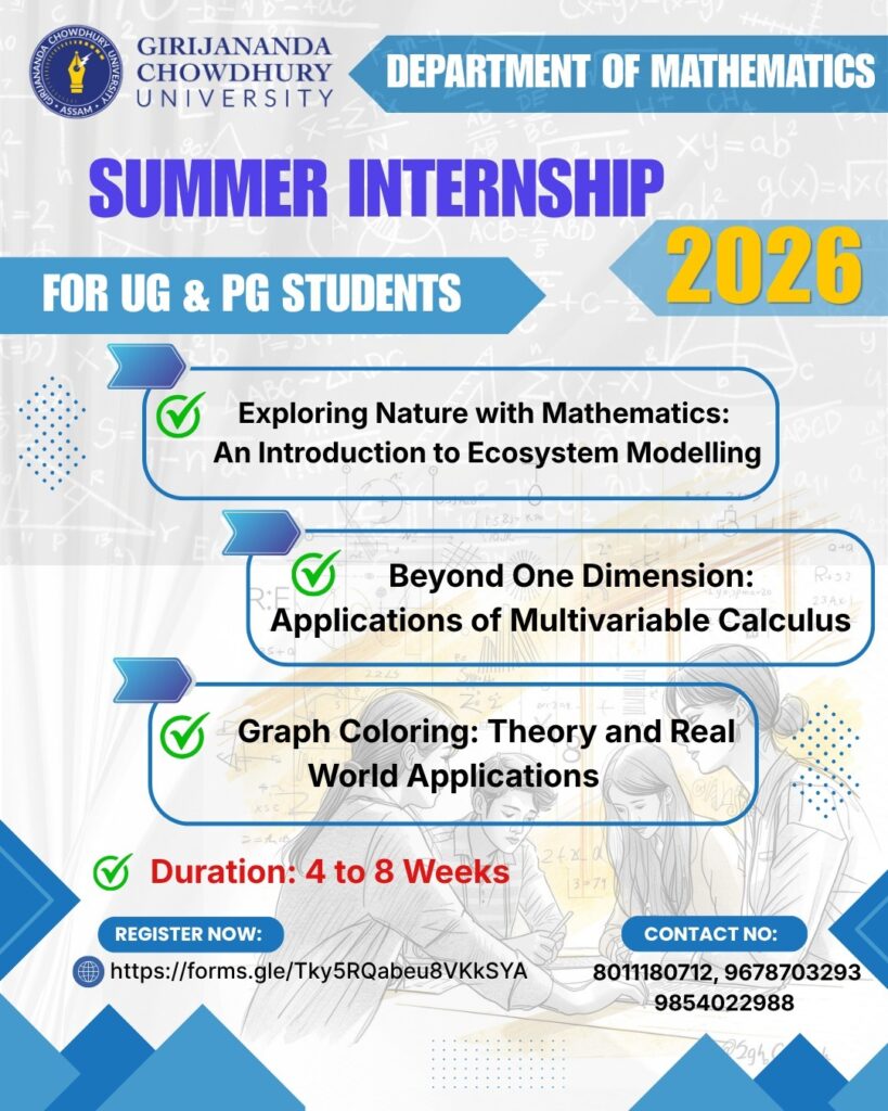The Department of Mathematics, Girijananda Chowdhury University is excited to offer an Internship Programme in Mathematics for students pursuing Undergraduate (UG) and Postgraduate (PG) programmes.