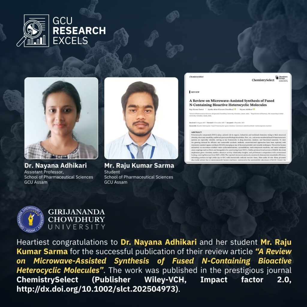 Heartiest congratulations to Dr. Nayana Adhikari and her student Mr. Raju Kumar Sarma on the successful publication of their review article in the prestigious journal ChemistrySelect (Wiley-VCH)—a remarkable achievement in pharmaceutical research and academic excellence
