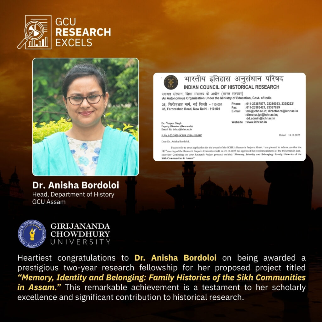 Heartiest congratulations to Dr. Anisha Bordoloi, Head, Department of History, GCU Assam, on being awarded a prestigious two-year research fellowship by the Indian Council of Historical Research (ICHR) for her project “Memory, Identity and Belonging: Family Histories of the Sikh Communities in Assam.”