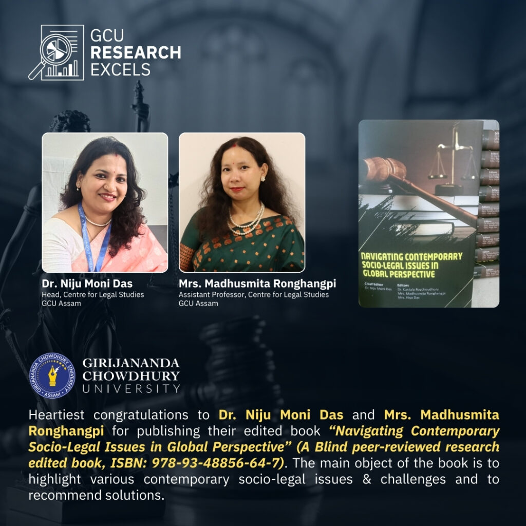 Huge congratulations to Dr. Niju Moni Das and Mrs. Madhusmita Ronghangpi from the Centre for Legal Studies at GCU Assam on the publication of their new edited book! Titled “Navigating Contemporary Socio-Legal Issues in Global Perspective,” this blind peer-reviewed research work dives deep into the complex challenges of modern society and offers critical recommendations for the future. We are proud to see our faculty leading the way in global academic discourse.