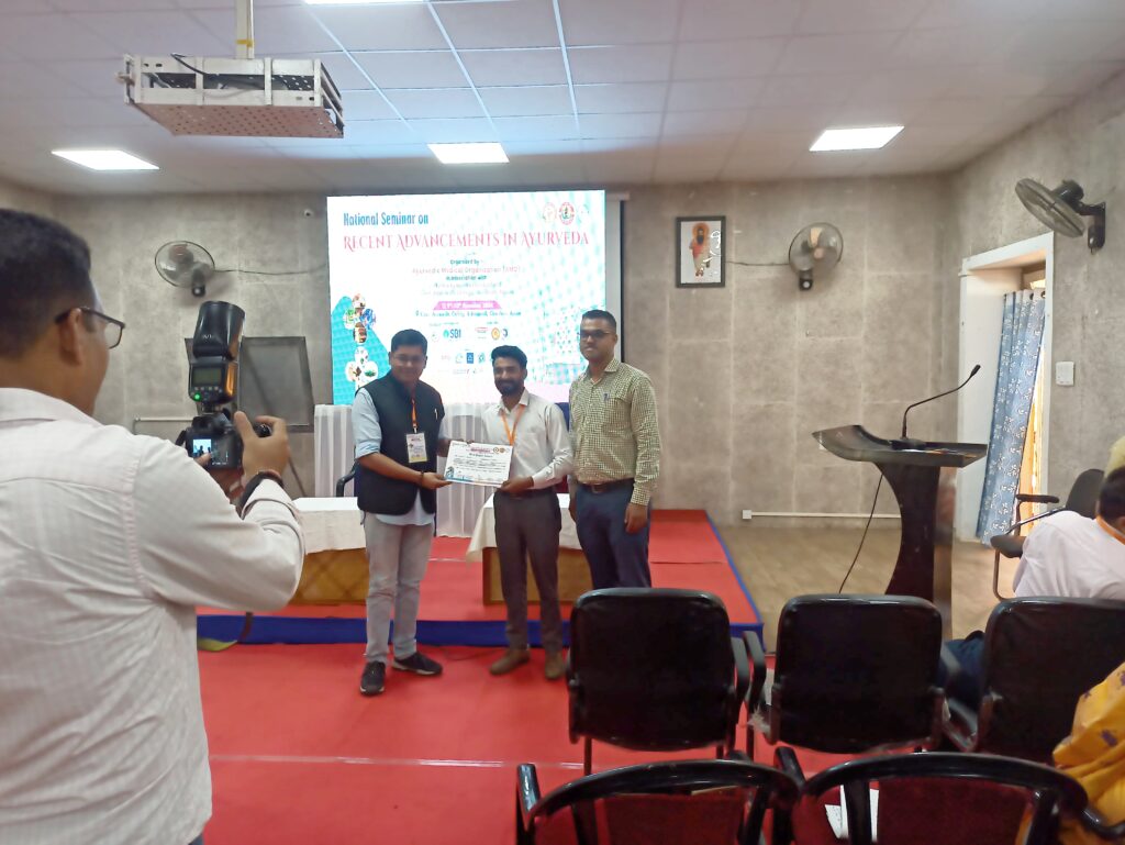 We are delighted to announce that Mr. Susankar Kushari, Assistant Professor at School of Pharmaceutical Sciences, Girijananda Chowdhury University, Guwahati, Assam, has been honoured with the Best Oral Presentation Award at the National Seminar on “Recent Advancements in Ayurveda,” held on November 9-10, 2024, at Govt. Ayurvedic College & Hospital, Guwahati, and organized by the Ayurvedic Medical Organization (AMO). The seminar brought together leading experts, academics, and industry professionals to discuss advancements and innovations in R&D, Ayurveda pharmaceuticals, and industry trends.