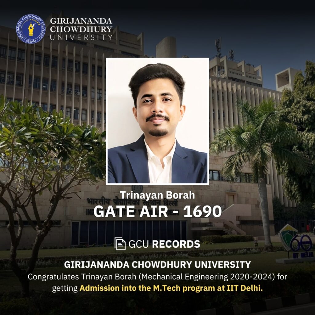 We are thrilled to share that Trinayan Borah (Mechanical Engineering, Batch 2020–2024) has secured an impressive GATE All India Rank 1690 and earned admission into the prestigious M.Tech program at IIT Delhi!